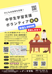 | 募集対象 | 子どもと関わることが好きな学生・社会人 国・社・数・理・英 のどれかに対応できる方 |